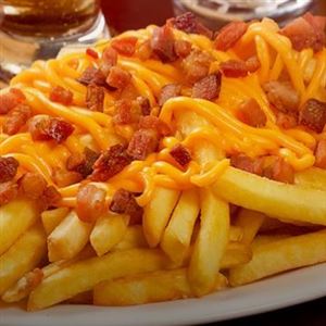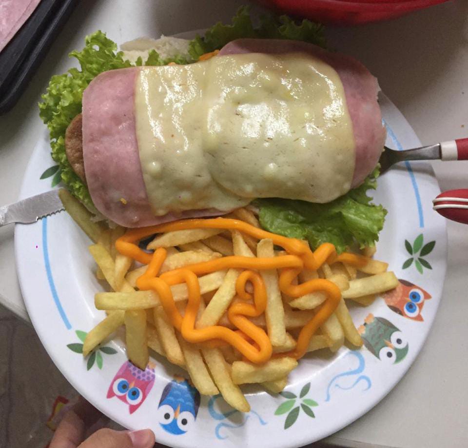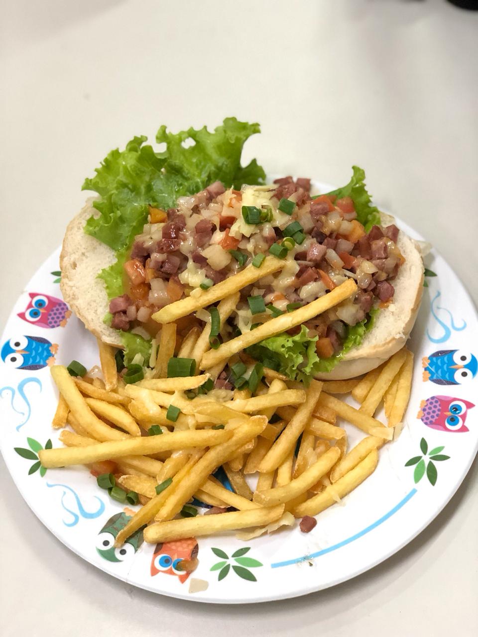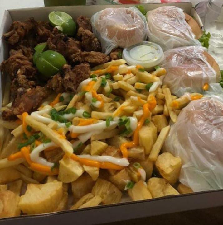 2 salsichas, purê, salada, batata palha, milho, frango com cheddar e 250g de batata frita