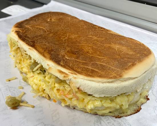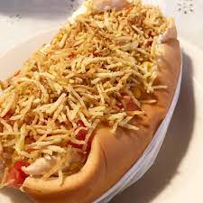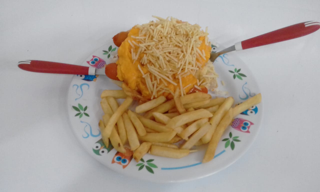 2 salsichas, purê, salada, batata palha, milho, calabresa com Catupiry e 250g de batata palha