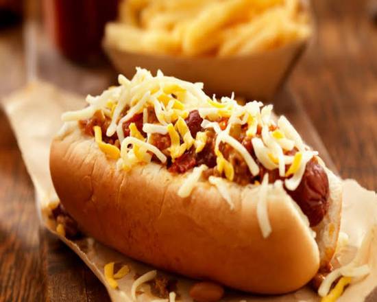 2 salsichas, purê, salada, batata palha, milho, calabresa com cheddar e 250g de batata palha